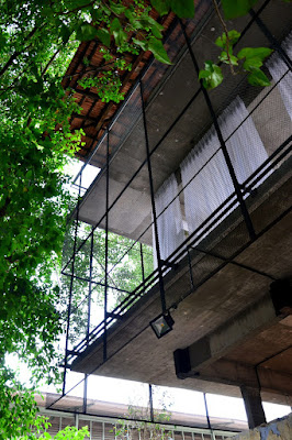 un dels pavellons que formen el conjunt d'edificis de l'hotel s'instal·la en una antiga construcció en desús i es prolonga a una certa alçada sobre el jardí amb un sistema de plataformes de formigó que protegeixen de la pluja i es tanquen perimetralment per cortines i una lleu malla contínua. un d'aquests espais a l'ombra i immers en el corrent d'aire. les imatges són molt suggeridores.